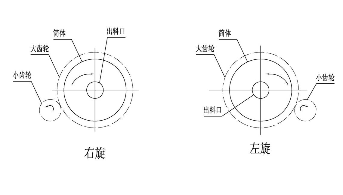 有許多客戶經(jīng)常會問,怎么才能正確的判斷球磨機運轉(zhuǎn)時是左旋還是右旋,今天河南豫暉礦山機械有限公司技術(shù)人員以圖為為例為大家解這個因惑:要想判斷球磨機是左旋還是右旋,要從球磨機出料口(靠近大齒輪一端)向進料口方向看,筒體逆時針旋轉(zhuǎn)為左旋,筒體順時針旋轉(zhuǎn)為右旋;在布置圖上,左旋布置時,傳動部分(過橋)在筒體右側(cè);右旋布置時,傳動部分(過橋)在筒體左側(cè)。如下圖所示: