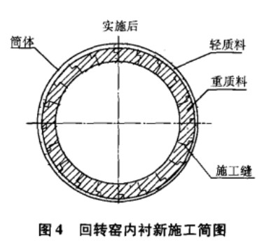 經(jīng)過與原料廠家、大修部門對(duì)該問題的共同探討,較確定將原有兩條澆注料之間的直縫施工修改為有錯(cuò)臺(tái)的施工縫,阻擋在高溫條件下高溫炭粉由施工縫進(jìn)入輕質(zhì)料層;剞D(zhuǎn)窯內(nèi)襯新施工簡(jiǎn)圖見圖4。此項(xiàng)措施較明顯地改善了內(nèi)襯的使用狀況,次采用就使回轉(zhuǎn)窯內(nèi)襯的使用壽命提高到了440天以上。